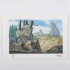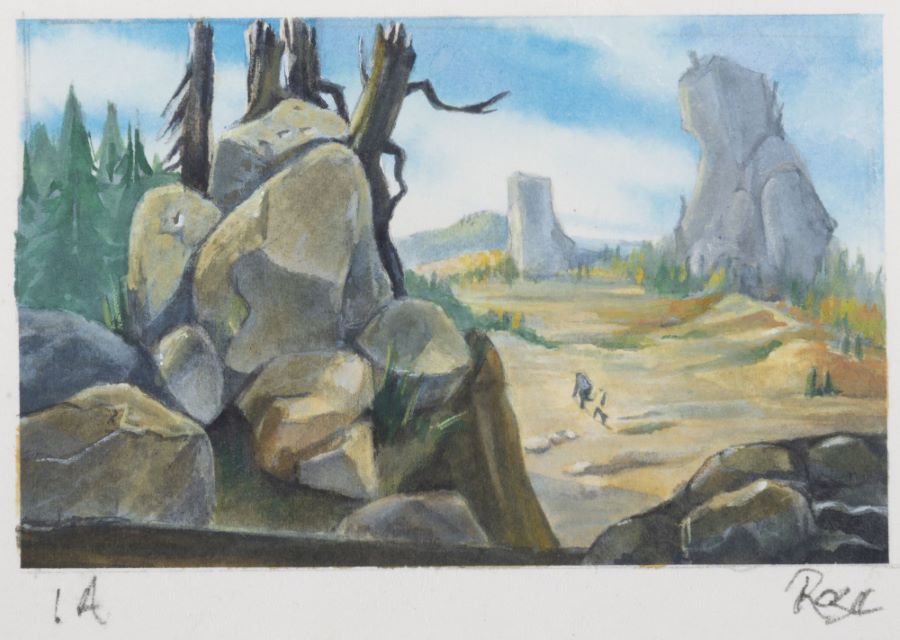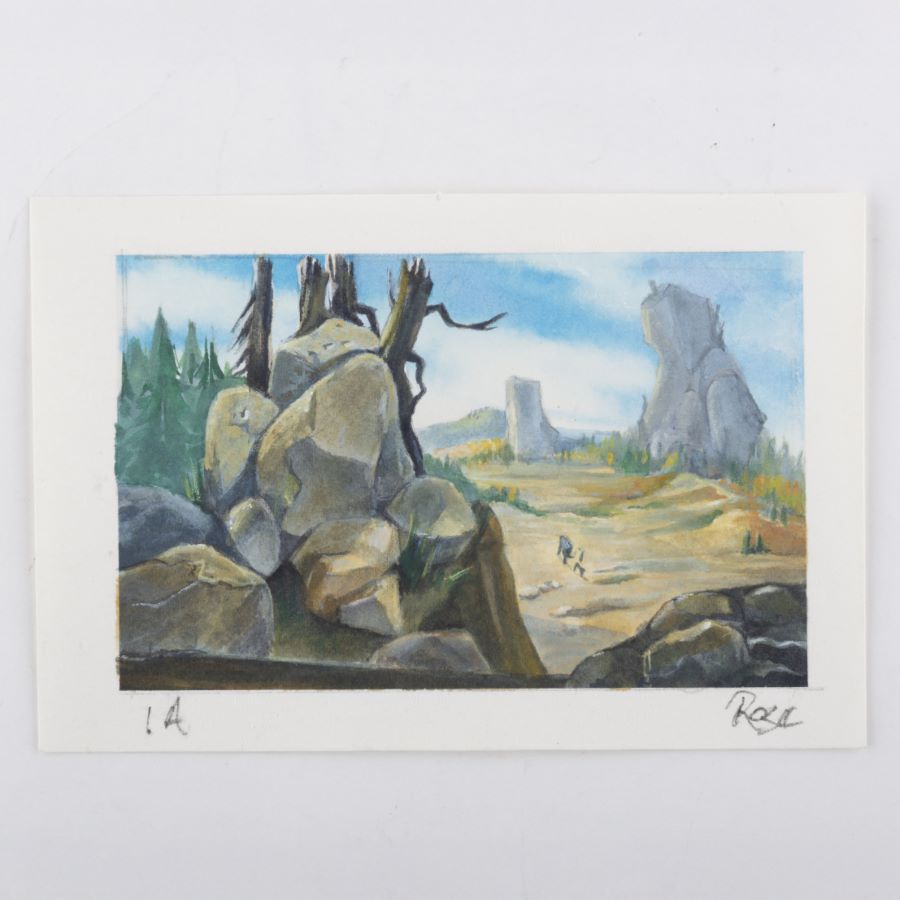 A concept painting from the Fox Studios animated film “Ice Age” (2002). Featuring a view from above with Manny, Sid, and Diego walking through a sunny wilderness pass, the painting was created at the studio and used during the animation process. This painting was created by studio concept artist Michael Rose, and the painting is hand-signed by the artist below the imagery. Concept imagery is created early in development to suggest and finalize the general layout, color palette, and characters present in a film’s scene. Measuring 3.5”x5.25” overall, with the image area measuring 2.75”x4.25”, the concept painting is in very good condition with light edge wear and pin holes in the corners.